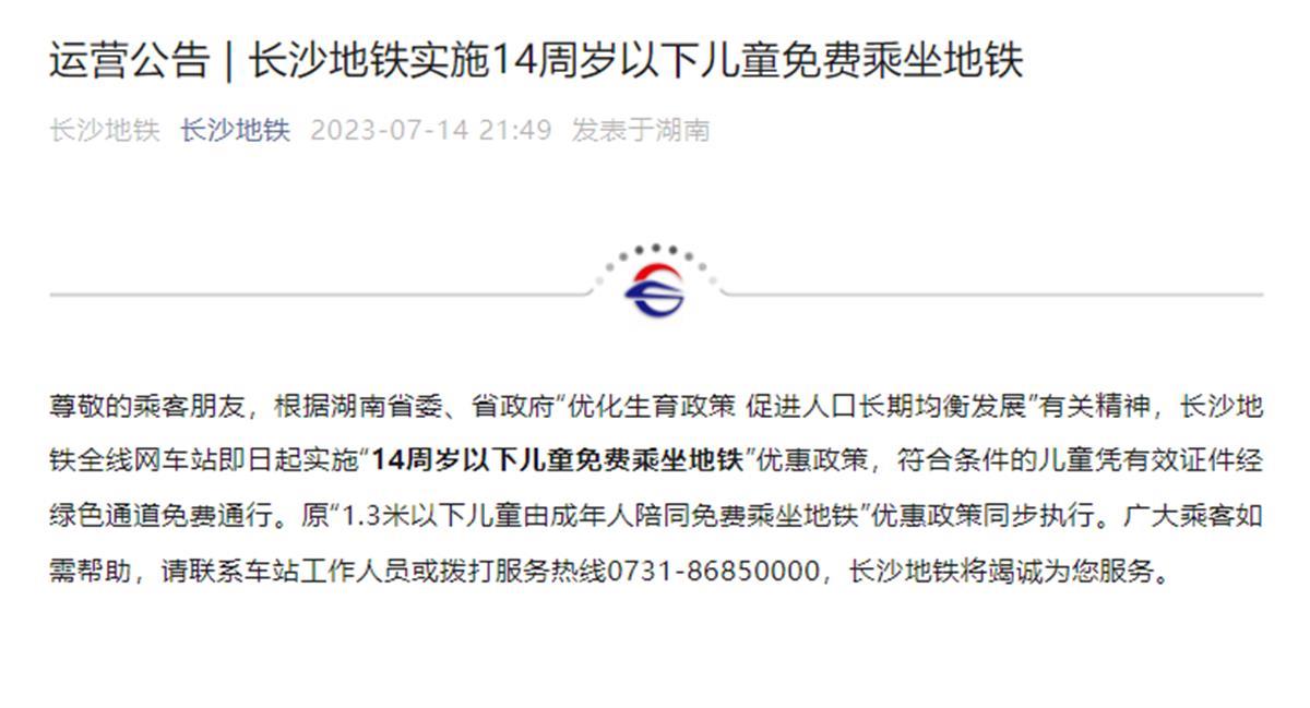 这则运营公告称,根据湖南省委、省政府“优化生育政策 促进人口长期均衡发展”有关精神,长沙地铁全线网车站即日起实施“14周岁以下儿童免费乘坐地铁”优惠政策,符合条件的儿童凭有效证件经绿色通道免费通行。原“1.3米以下儿童由成年人陪同免费乘坐地铁”优惠政策同步执行。