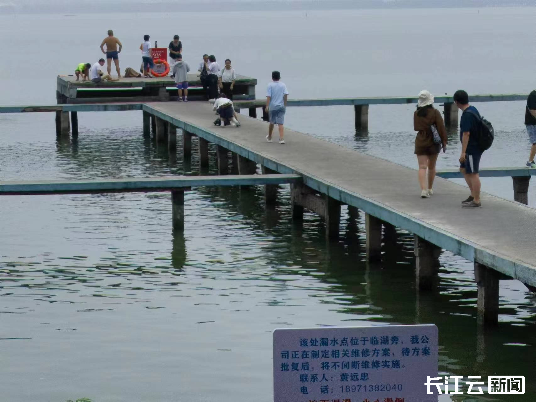 7月19日上午10点左右,长江云新闻记者来到凌波门,发现两侧的细窄栈道入口确实已被封住,但中间的主桥上仍有不少游客正在游玩,有的靠在栅栏上接电话,还有几人在桥下游泳。