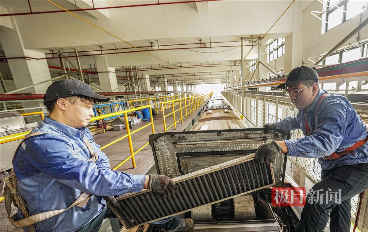 7月20日,极目新闻记者来到7号线野芷湖车辆段,只见一列列地铁的车厢顶上,检修人员正忙着对空调滤网进行更换。