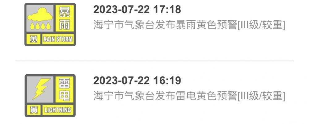 截止发稿时,海宁仍有暴雨黄色预警和雷电黄色预警生效中。