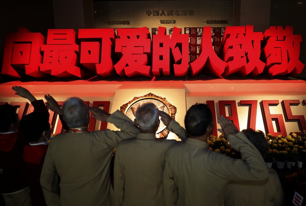 在位于辽宁省丹东市的抗美援朝纪念馆英烈厅,志愿军老战士和少先队员向牺牲的烈士致敬 图源:新华社