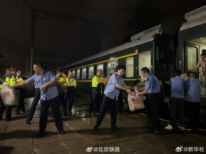 7月31日,国铁北京局分别从张家口、宣化地区紧急调配各类食品、饮用水等生活物资6000份,从张家口车务段抽调195人组建物资装卸队,将生活物资搬运到救援列车上。 微博@北京铁路 图