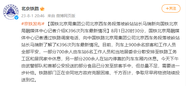 8月1日20时05分,国铁北京局融媒体中心记者,通过铁路调度电话,向K1178次列车添乘干部、中国铁路兰州局集团公司银川客运段北京车队副队长倪鹏,了解了车上现状。目前,全车841名旅客、30名乘务人员全部平安,无生命危险,在丰沙铁路沿河城站停靠的列车内休息。铁路部门投送的食品可以满足今天需要,列车上成立了由车队工作人员和党员旅客组成的临时党支部,协助分发物资、安抚旅客情绪、维持列车秩序。