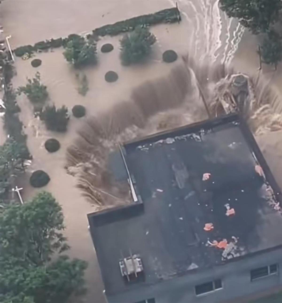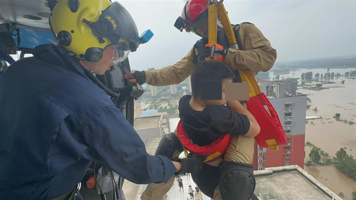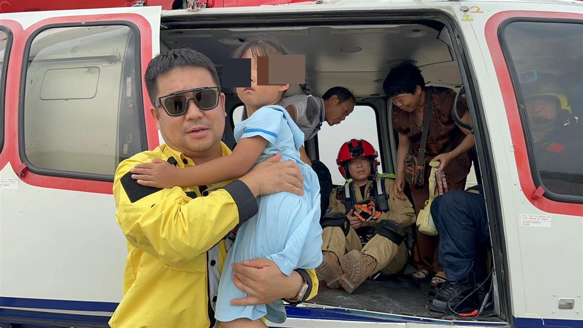 下午2时30分,公羊救援队救援直升机从水尚仁佳小区成功救出7名群众,其中包括4名幼儿。