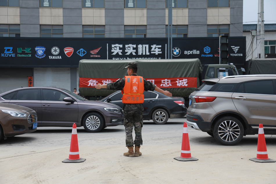 8月4日,武警官兵正在维护交通秩序。机动支队江腾摄