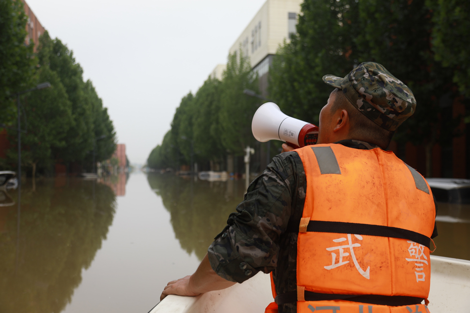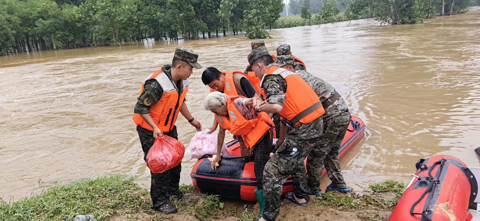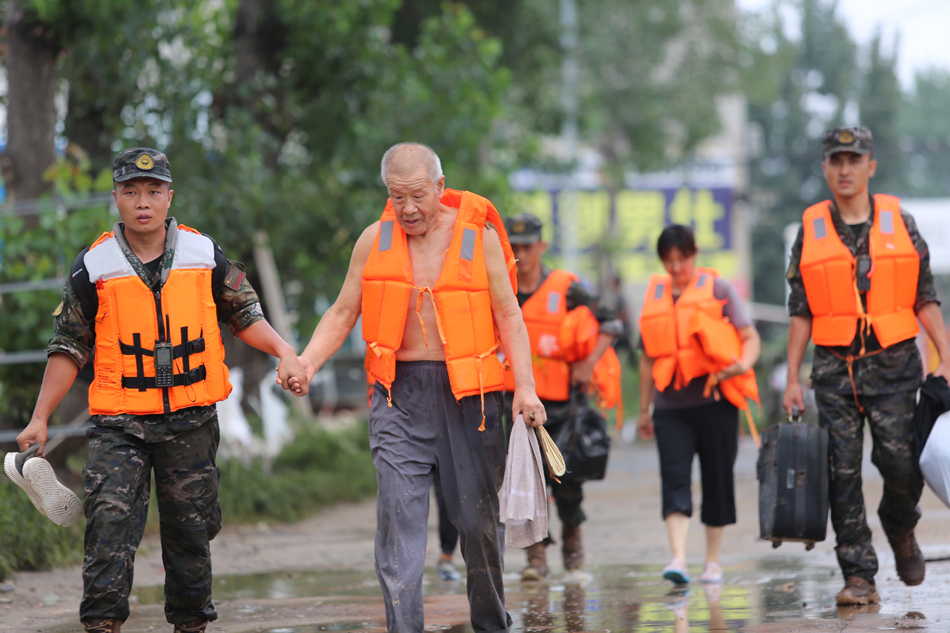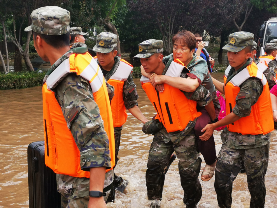 2023年8月4日,武警河北总队官兵将受困老人转移到安全地带。石家庄支队杨刘摄