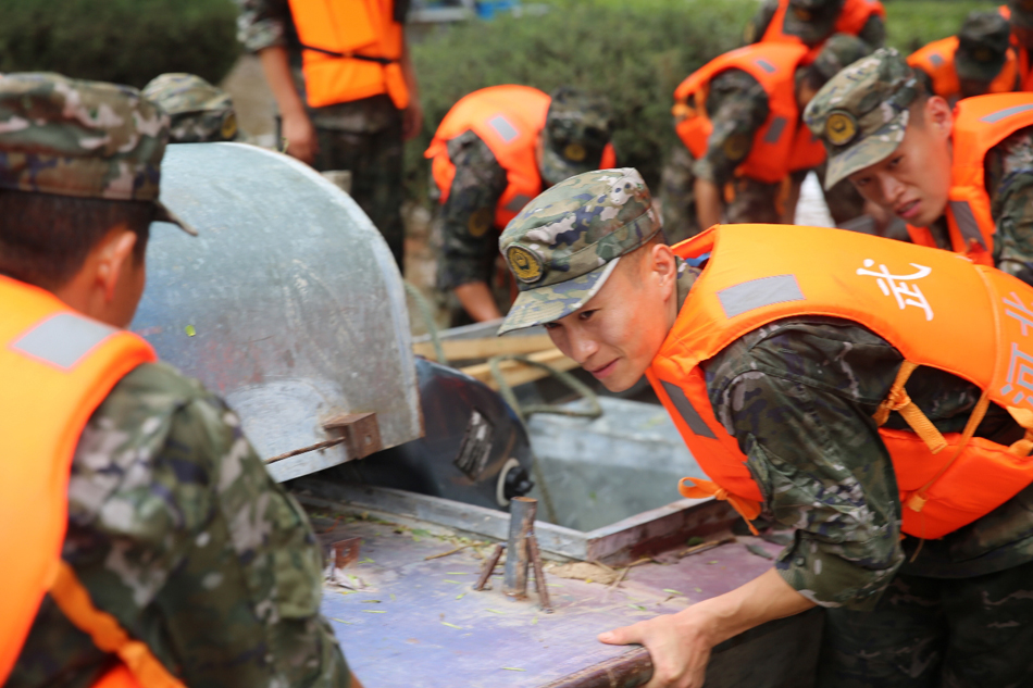 8月4日,武警官兵合力收纳救援工具。机动支队赵佳亮摄