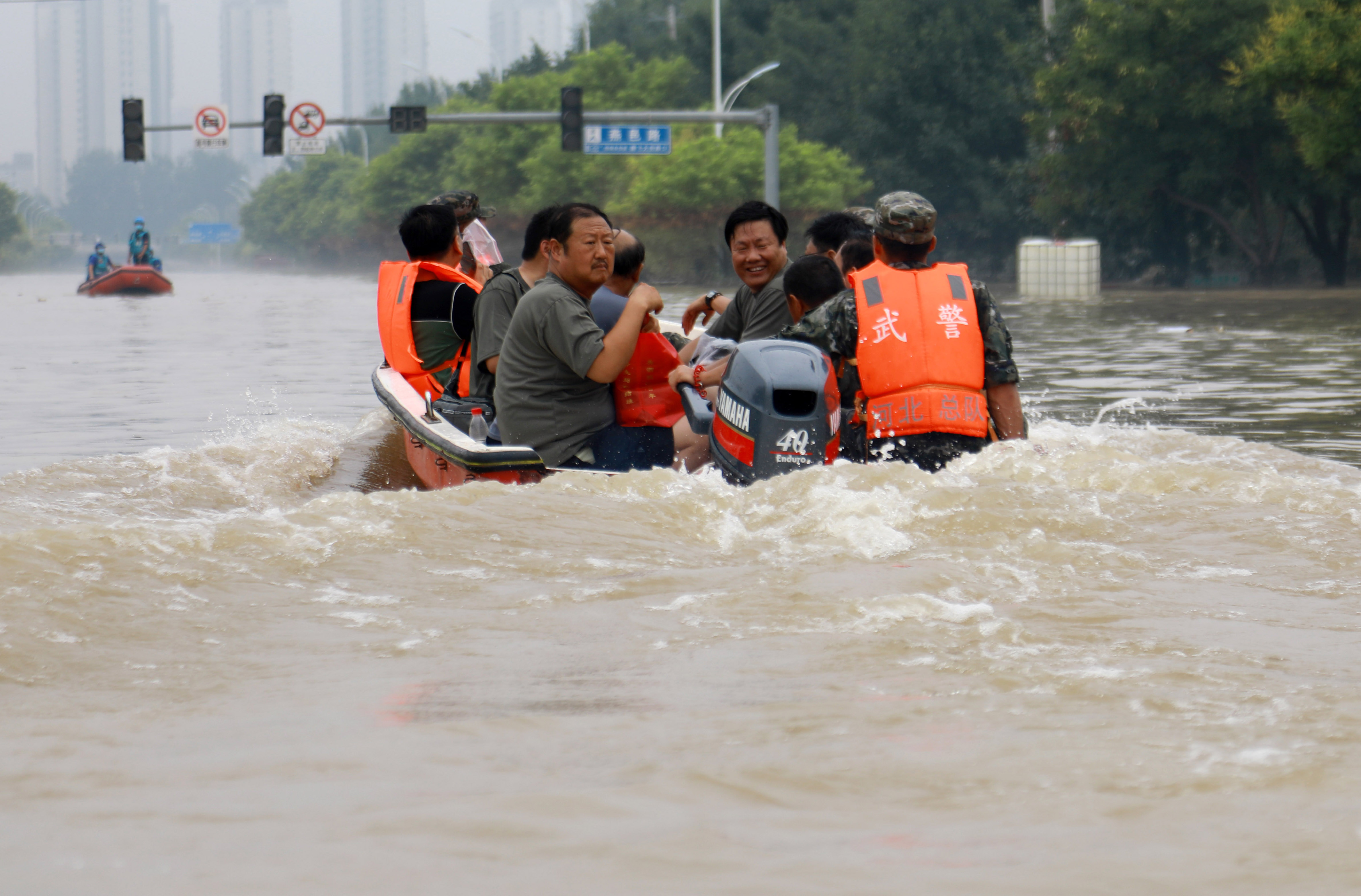 8月4日,武警官兵用冲锋舟载着群众奔赴安全地带。机动支队江腾摄