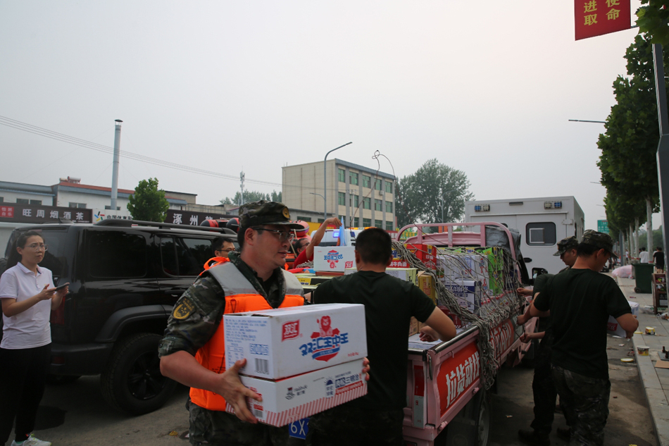 8月4日,武警官兵正在搬运救灾物资。机动支队赵佳亮摄