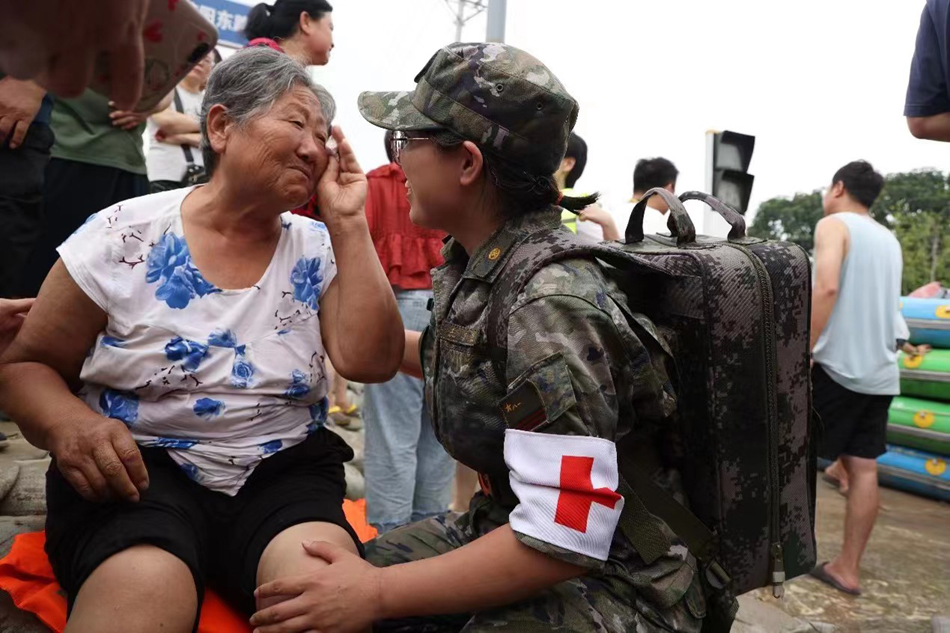 8月4日,医护人员询问老人身体状态。机动支队苑晟民摄