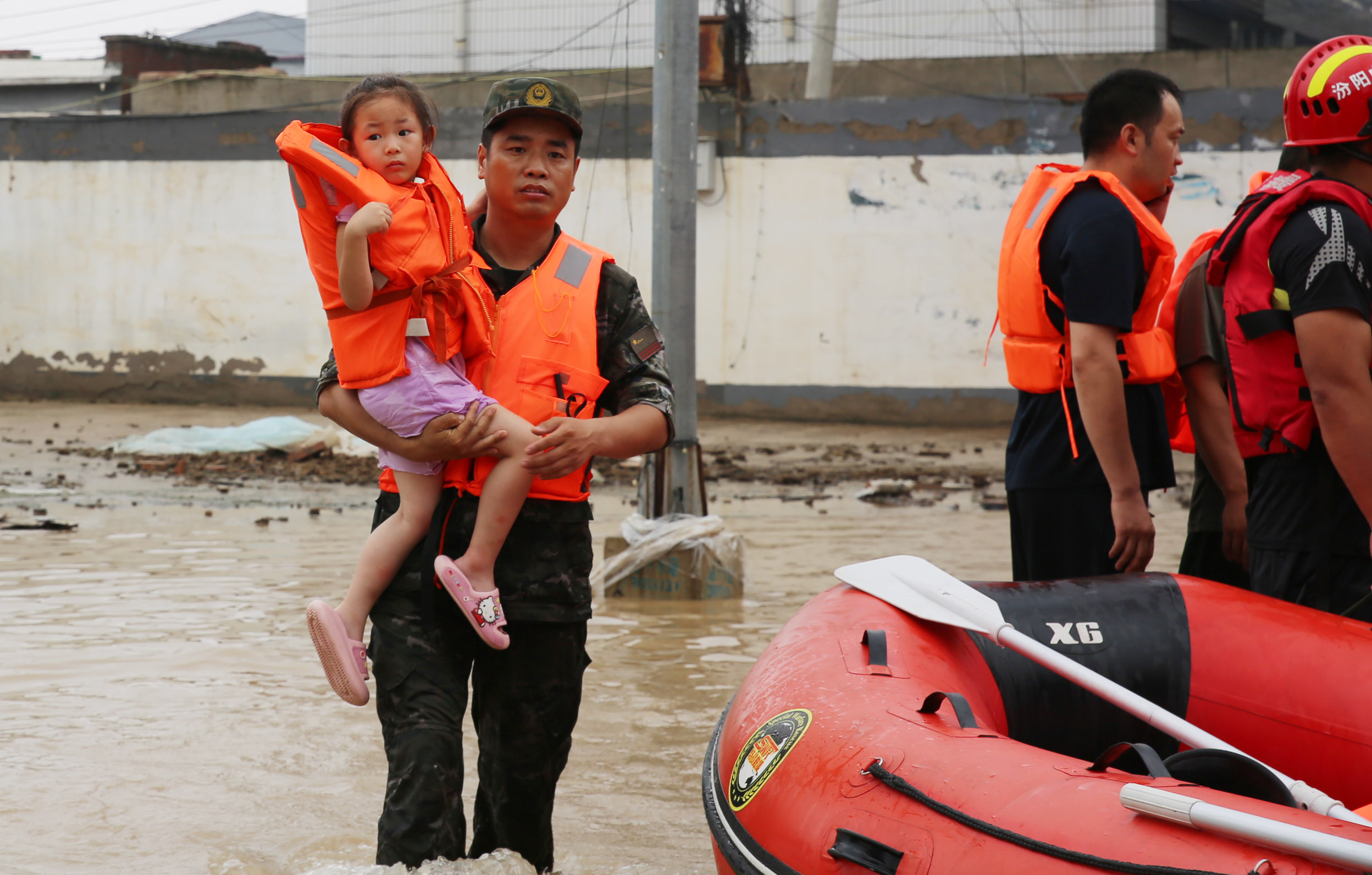 8月4日,武警官兵抱着小女孩走向安置点。机动支队赵佳亮摄