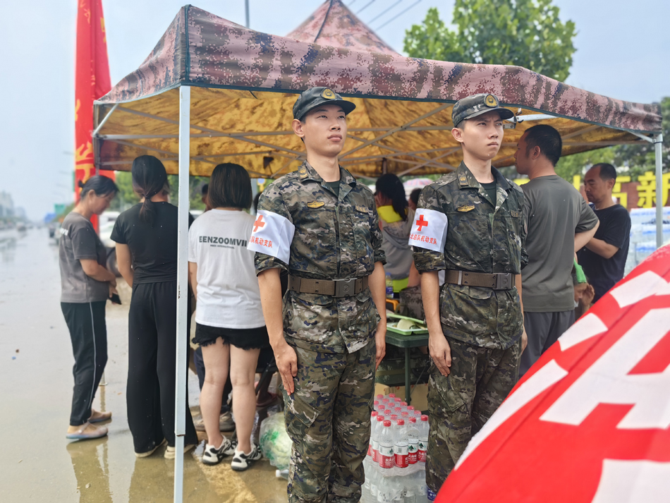8月4日,涿州抗洪一线突然下起大雨。河北武警救援医疗点官兵,主动将遮阳棚让出,容纳受灾群众避雨。机动支队苑晟民摄
