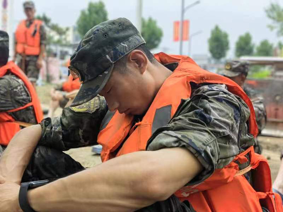 8月4日,救援官兵坐着就睡着了。保定支队郑泽楠摄