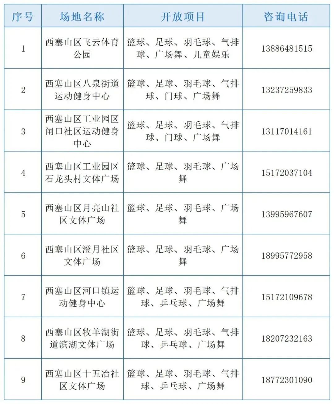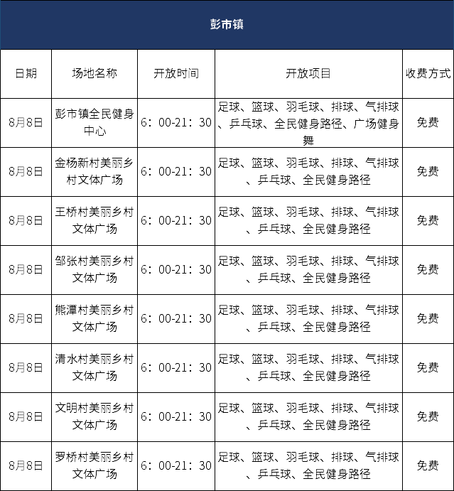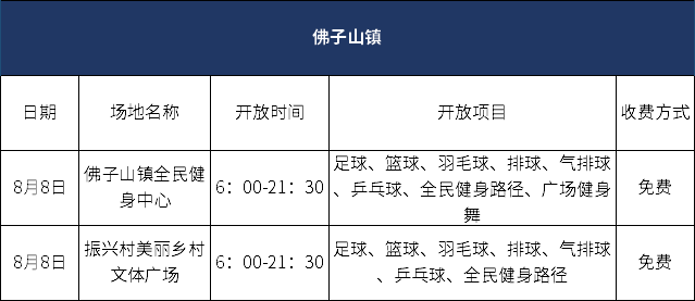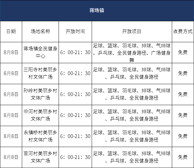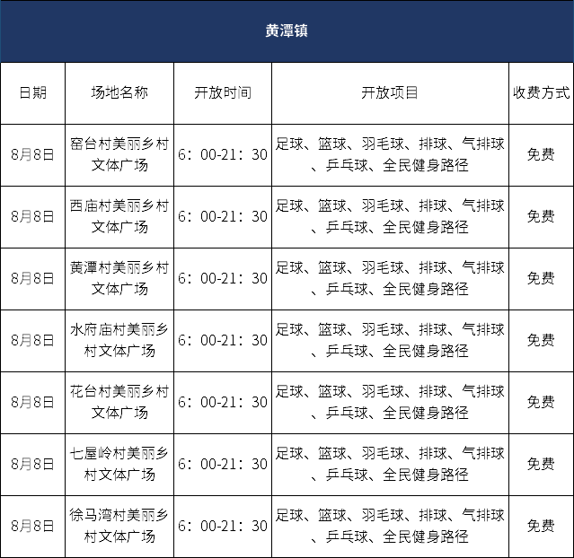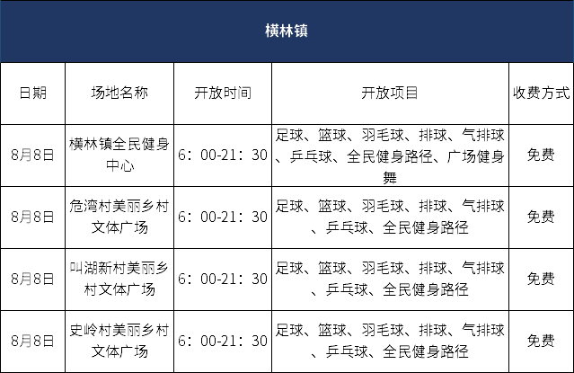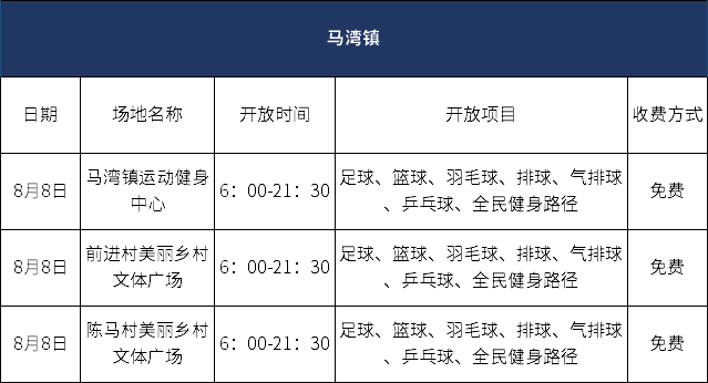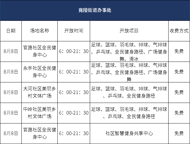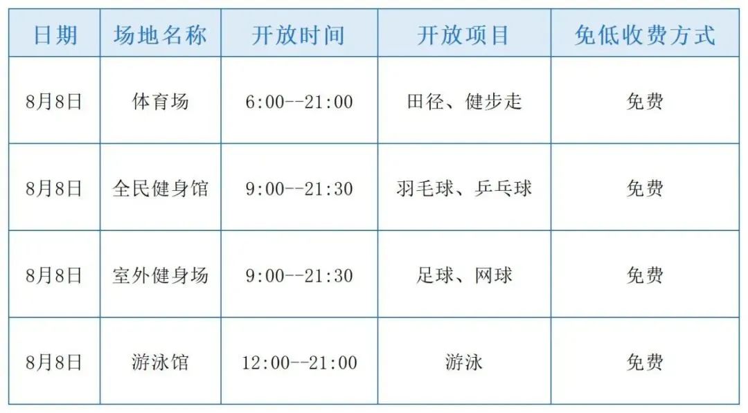 8月8日7:00-21:00,室内综合馆、室内篮球馆、室内羽毛球馆、室外足球场、室外网球场、网球中心赛场免费开放。