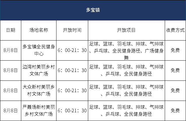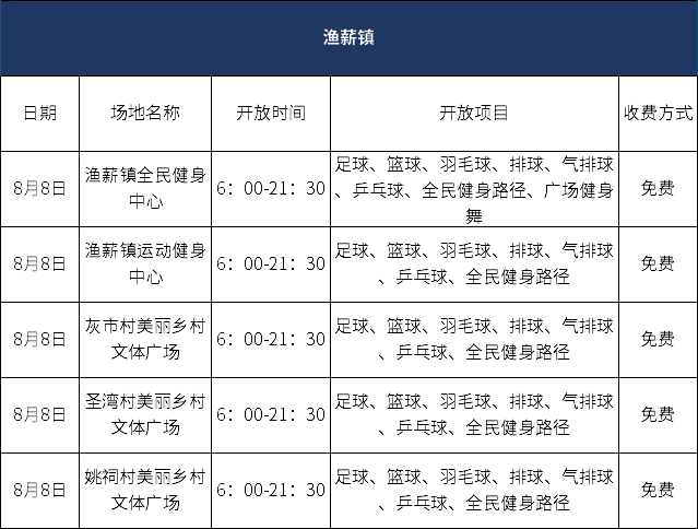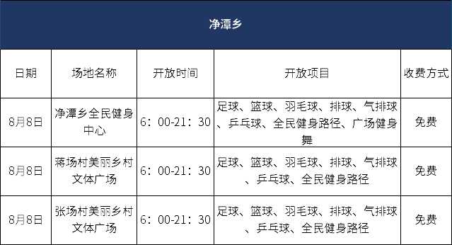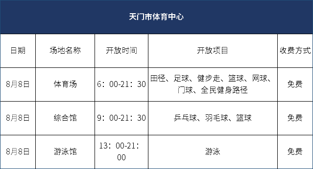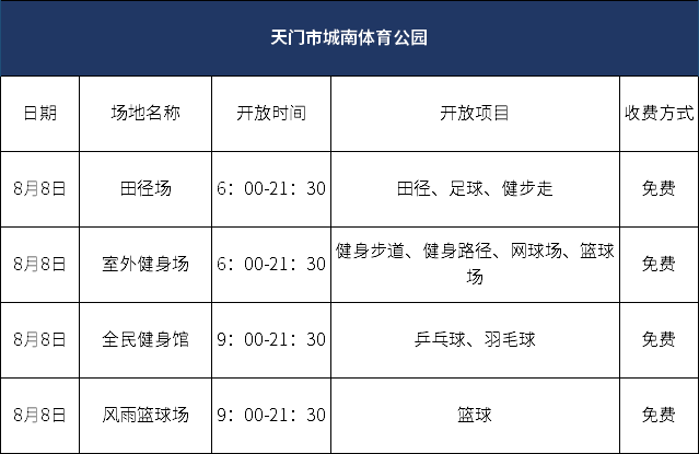 8月8日8:30-12:00、14:30-18:00,体育馆主馆、东副馆篮球项目,体育馆二楼南、北环廊大厅羽毛球、乒乓球项目免费开放。8月8日8:30-11:30、14:30-17:30,体育中心室外网球场免费开放。
