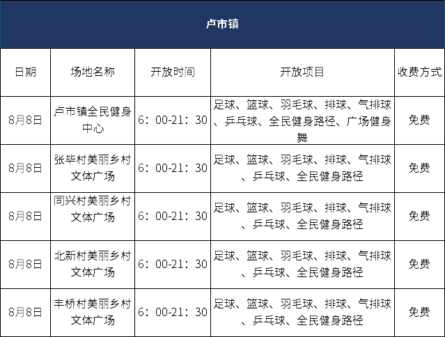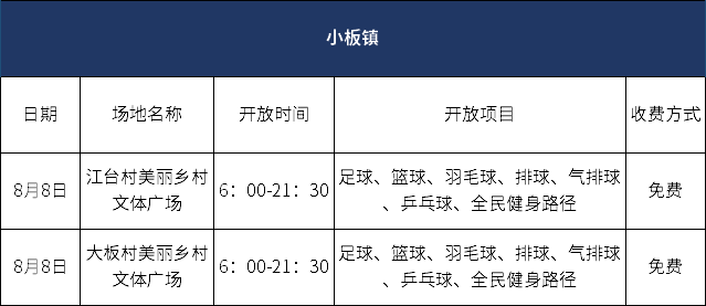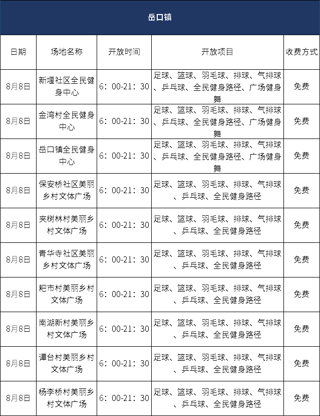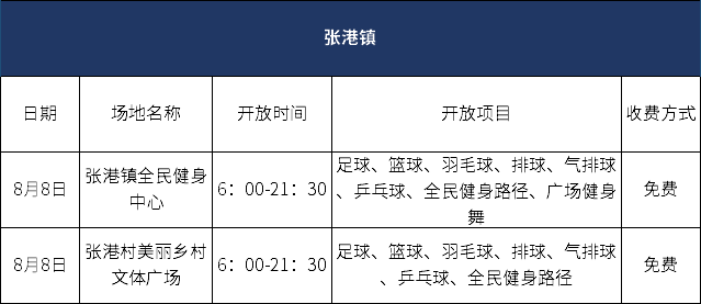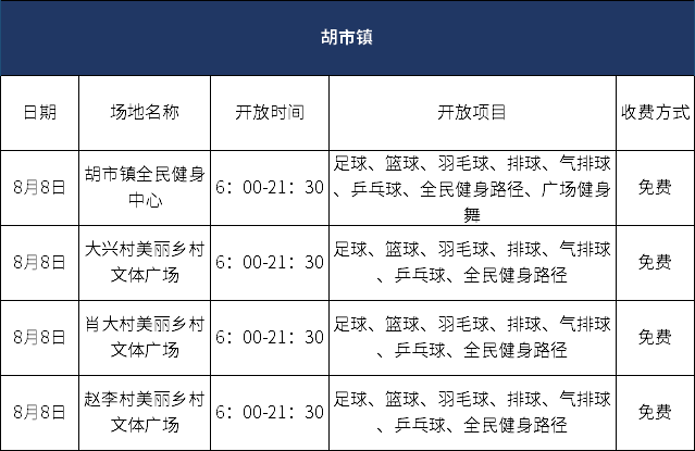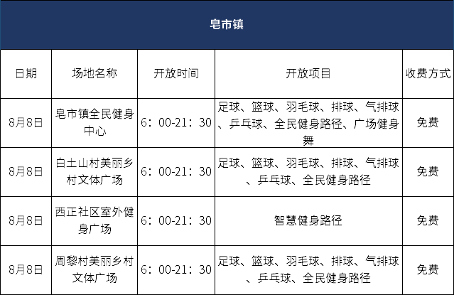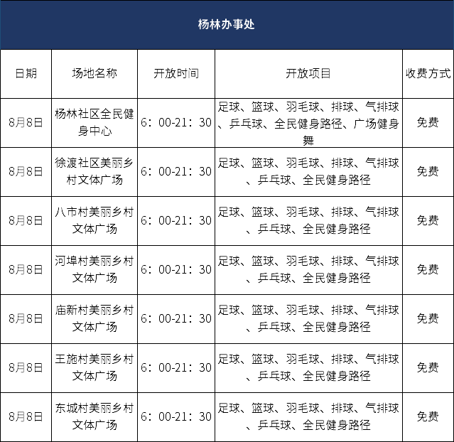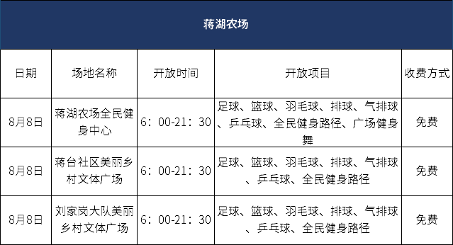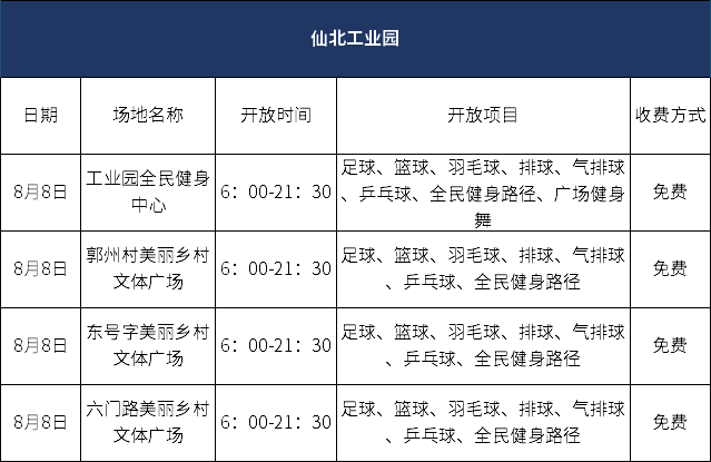 8月8日9:00-21:00,室内羽毛球场、室内篮球场、室外足球场免费开放。