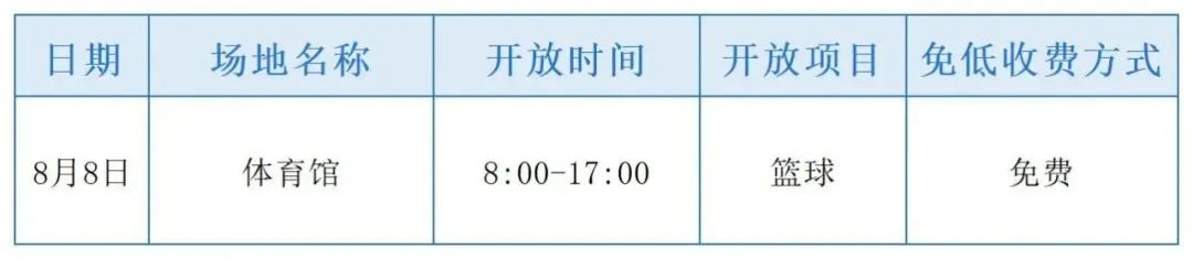 8月8日9:00-21:00,室外足球场、室外篮球场免费开放。