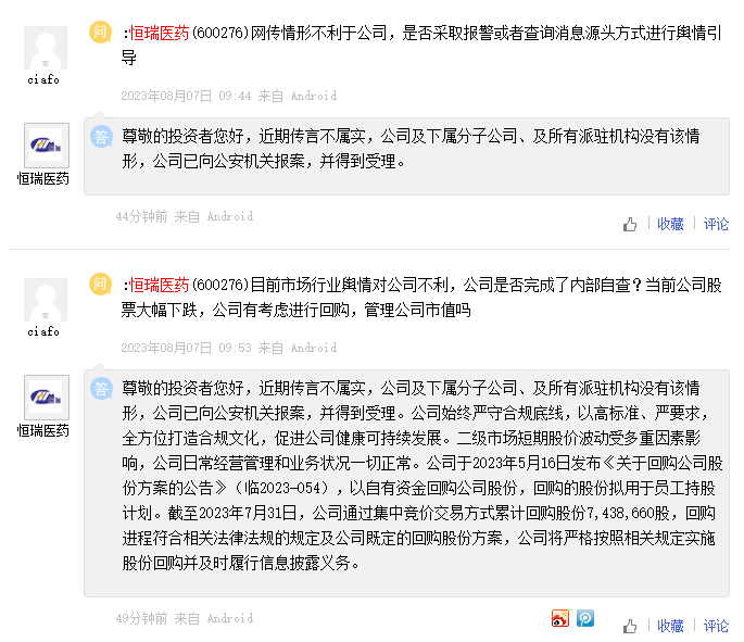 据上证e互动,8月7日,有投资者向恒瑞医药提问,“目前市场行业舆情对公司不利,公司是否完成了内部自查?当前公司股票大幅下跌,公司有考虑进行回购,管理公司市值吗”。8月9日,恒瑞医药在平台回答投资者提问称,近期传言不属实,公司及下属分子公司、及所有派驻机构没有该情形,公司已向公安机关报案,并得到受理。