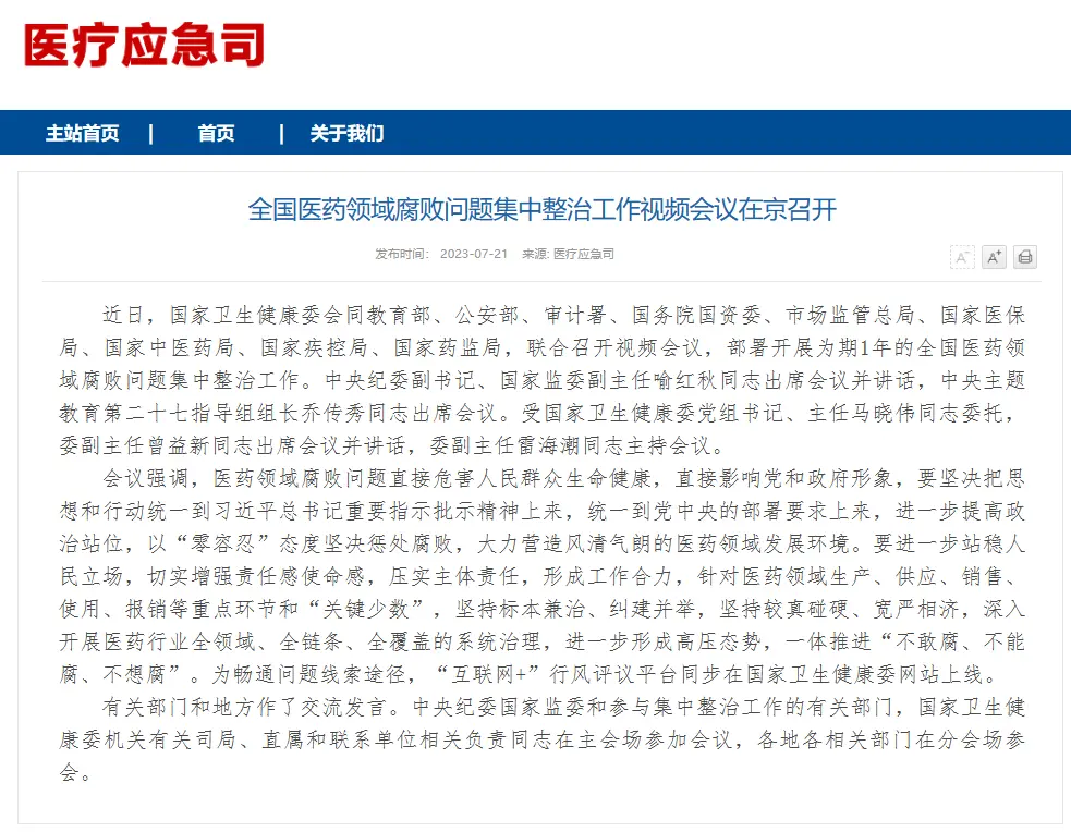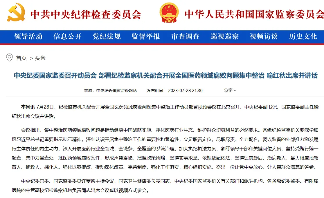 紧接着,据中纪委网站消息,7月28日,纪检监察机关配合开展全国医药领域腐败问题集中整治工作动员部署视频会议在北京召开。会议指出,要以监督的外部推力激发履行主体责任的内生动力,深入开展医药行业全领域、全链条、全覆盖的系统治理。加大执纪执法力度,紧盯领导干部和关键岗位人员,坚持受贿行贿一起查,集中力量查处一批医药领域腐败案件,形成声势震慑。