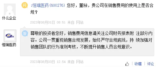 此外,8月1日,曾有恒瑞医药投资者提问,公司在销售费用的使用上是否合规?恒瑞医药8月3日回应称,销售费用信息请关注公司财务报表附注部分内容。公司一贯重视销售合规发展,始终严守合规底线,持续加强对销售团队的行为准则考核,不断提升销售人员合规意识。