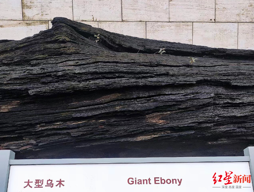 这块巨大的乌木位于金沙遗址博物馆出口位置,很醒目。其铭牌介绍称是1997年修建达成铁路时,在成都市青白江区出土。“树种为香果树。经过碳-14测定,其死亡年代约距今6500年,生长年代近1000年。现在香果树在成都平原周边山区还有少量生长,是我国二类保护植物。”
