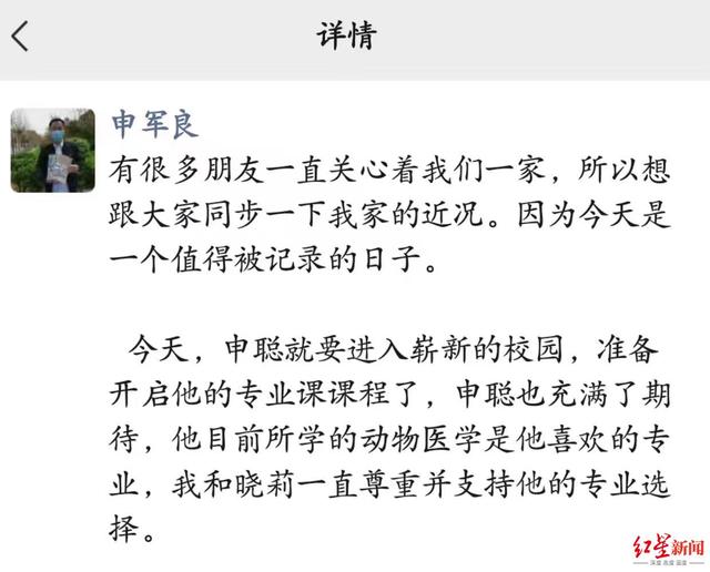 “今天是一个值得被记录的日子。”8月19日,申军良在自己的社交平台写下了这样的文字。他告诉网友,他的大儿子申聪即将进入新的学校,学习动物医学的专业课程。得知这个消息,网友们纷纷在评论区送上祝福。