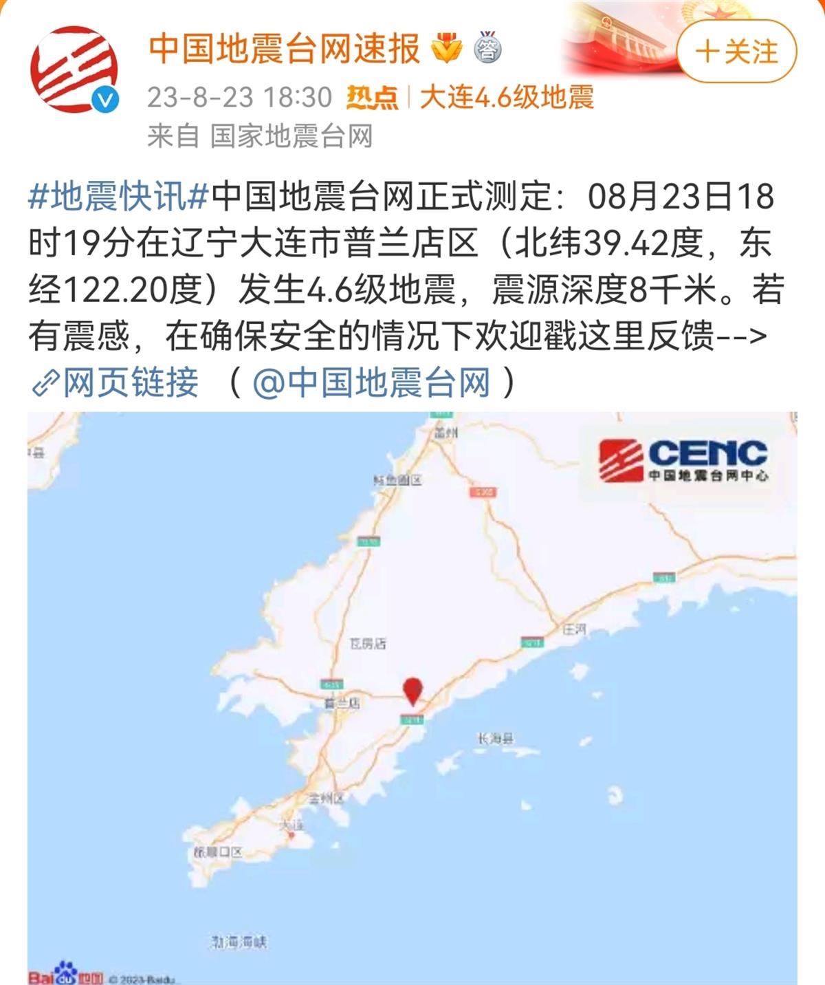 据通报,8月23日18时19分,在辽宁省大连市普兰店区(北纬39.42度,东经122.20度)发生4.6级地震,震源深度8千米。