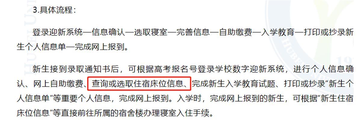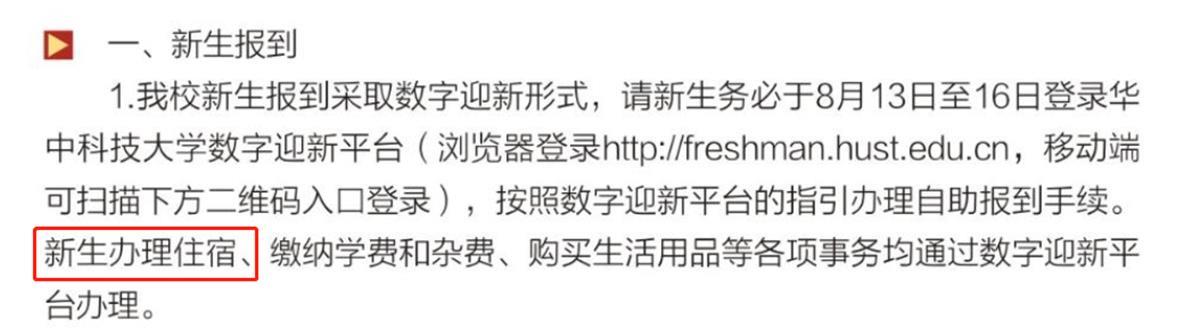 华中科技大学新生入学须知中提到,新生可在迎新平台(http://freshman.hust.edu.cn)自助报到,办理住宿。系统将告知新生所在公寓区及楼栋号码,点击进入即可选择心仪的宿舍及床位。选择完成后,可查询到自己同宿舍其他室友的情况。