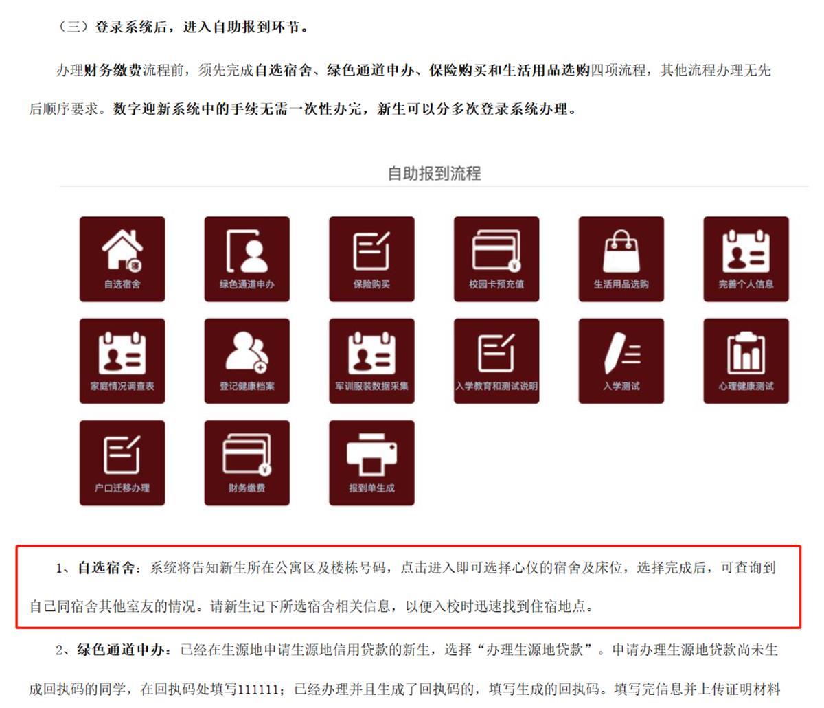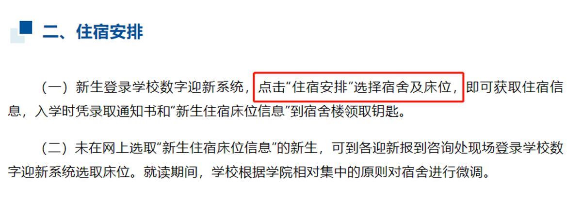 新生接到录取通知书后,可根据高考报名号登录学校数字迎新系统,查询或选取住宿床位信息。入学时,完成网上报到的新生,可根据“新生住宿床位信息”等直接前往所属的宿舍楼办理寝室入住手续。