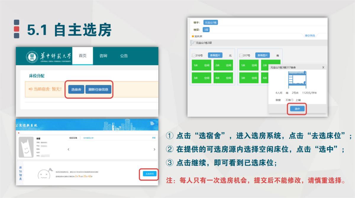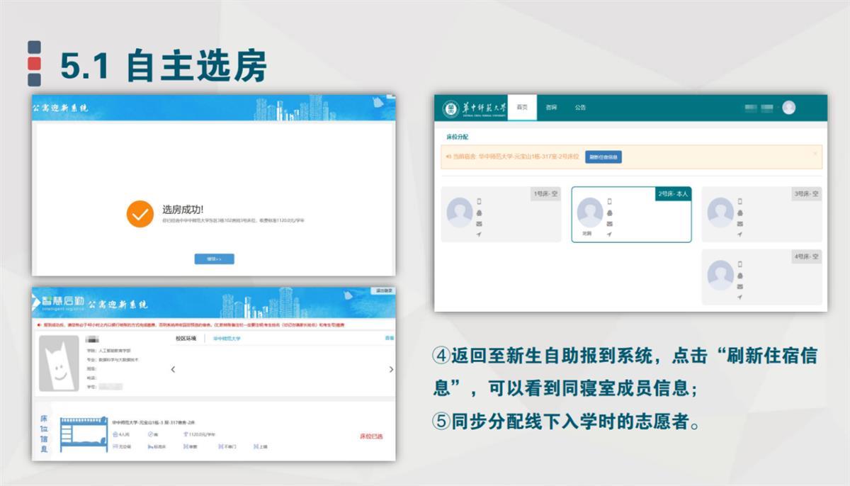新生可登录“自助服务网站(http://freshman.ccnu.edu.cn)-自主选房”,在提供的可选房源内选择空闲床位,并查询同寝室成员信息。
