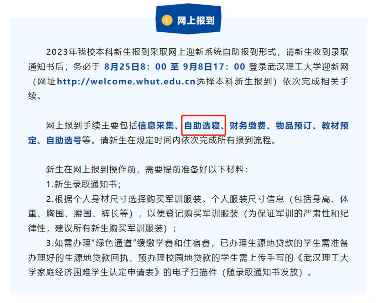 2023年武汉理工大学本科新生报到采取网上迎新系统自助报到形式,新生可于 8月25日8:00 至 9月8日17:00 登录武汉理工大学迎新网(网址http://welcome.whut.edu.cn选择本科新生报到)自助选寝。