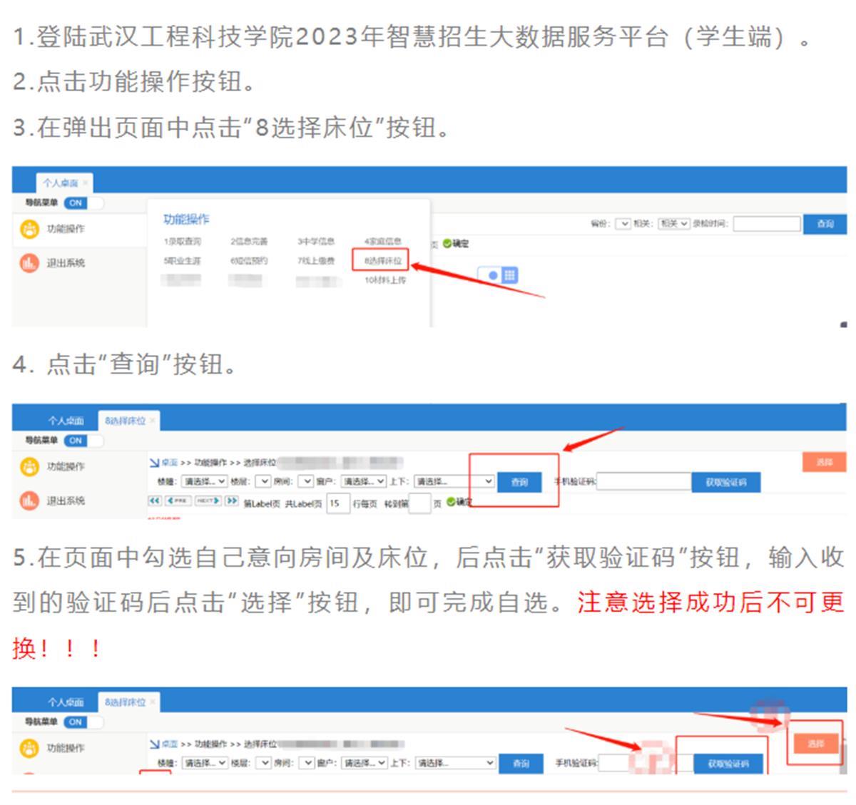 凡按《2023新生入学报到须知》的要求缴费成功(足额学杂费)的新生,可登录武汉工程科技学院2023年智慧招生大数据服务平台(学生端)(http://zsfw.wuhues.com:81/aspx/cq/stulogin.aspx),在网上优先自助选择寝室及床位(凡未提前缴费的新生,在入学报到后由各学院在分配系统随机安排寝室及床位)。