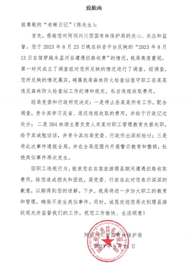 8月23日,旅游博主“老辣日记”发布视频称,他此前在四川阿坝州理县自驾游时,在一森林防火点被拦路收费500元。24日,极目新闻(报料邮箱:jimu1701@163.com)记者从博主陈先生处了解到,阿坝州川西国有林保护局向他发来致歉函,称拦路收费人员系该局森林防火检查站值守职工岳某某,现已被停止工作并给予行政记过处分,收取的相关款项被责令立即退还。