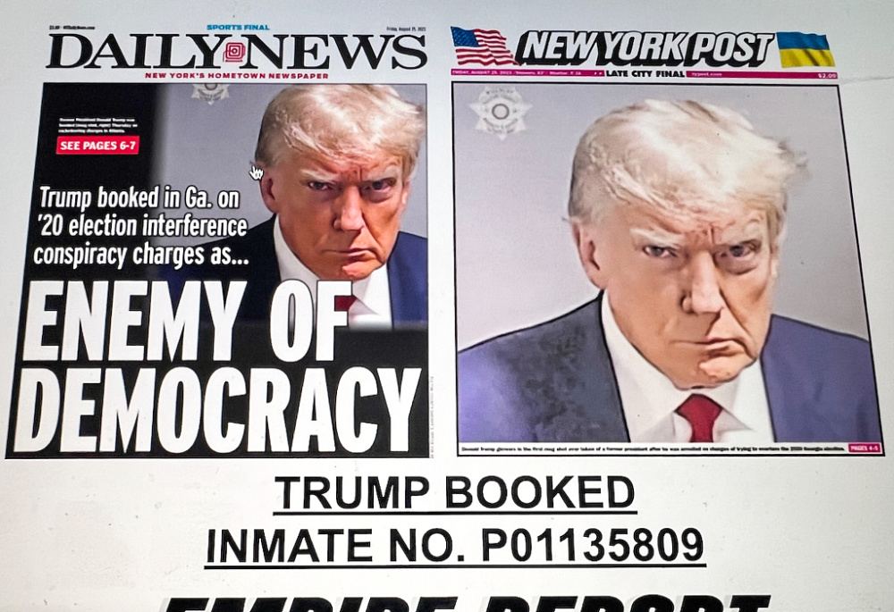 当地时间2023年8月25日,美国纽约,《每日新闻》和《纽约邮报》头版刊登了美国前总统特朗普的“监狱大头照”。(视觉中国)