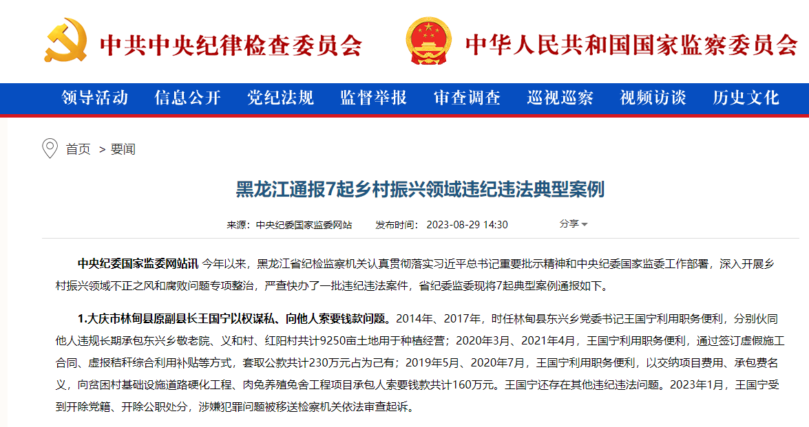 中央纪委国家监委网站讯今年以来,黑龙江省纪检监察机关认真贯彻落实习近平总书记重要批示精神和中央纪委国家监委工作部署,深入开展乡村振兴领域不正之风和腐败问题专项整治,严查快办了一批违纪违法案件,省纪委监委现将7起典型案例通报如下。