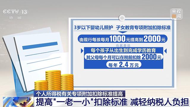 有关负责人表示,自2023年1月1日起,提高3岁以下婴幼儿照护、子女教育和赡养老人3项专项附加扣除标准。其中,3岁以下婴幼儿照护、子女教育专项附加扣除标准由现行每孩每月1000元提高到2000元,也就是说,每个孩子从出生到完成学历教育,其父母每个月可以在税前扣除2000元,每年2.4万元,这些扣除可以由父母双方分别享受,也可以由其中一方享受;赡养老人专项附加扣除标准由每月2000元提高到3000元,独生子女按照每月3000元的标准定额扣除,非独生子女与兄弟姐妹分摊每月3000元的扣除额度,每人分摊的额度不超过每月1500元。
