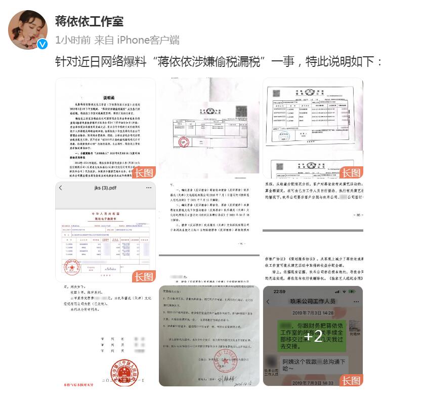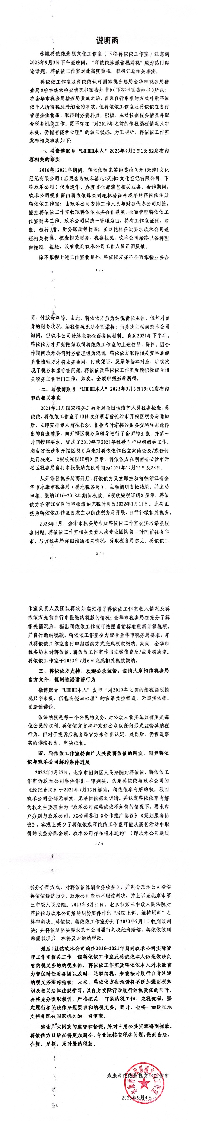 9月4日,@蒋依依工作室 发说明函回应涉嫌偷税漏税一事,称蒋依依及工作室确实曾以自行申报的方式补缴蒋依依个人所得税及滞纳金。