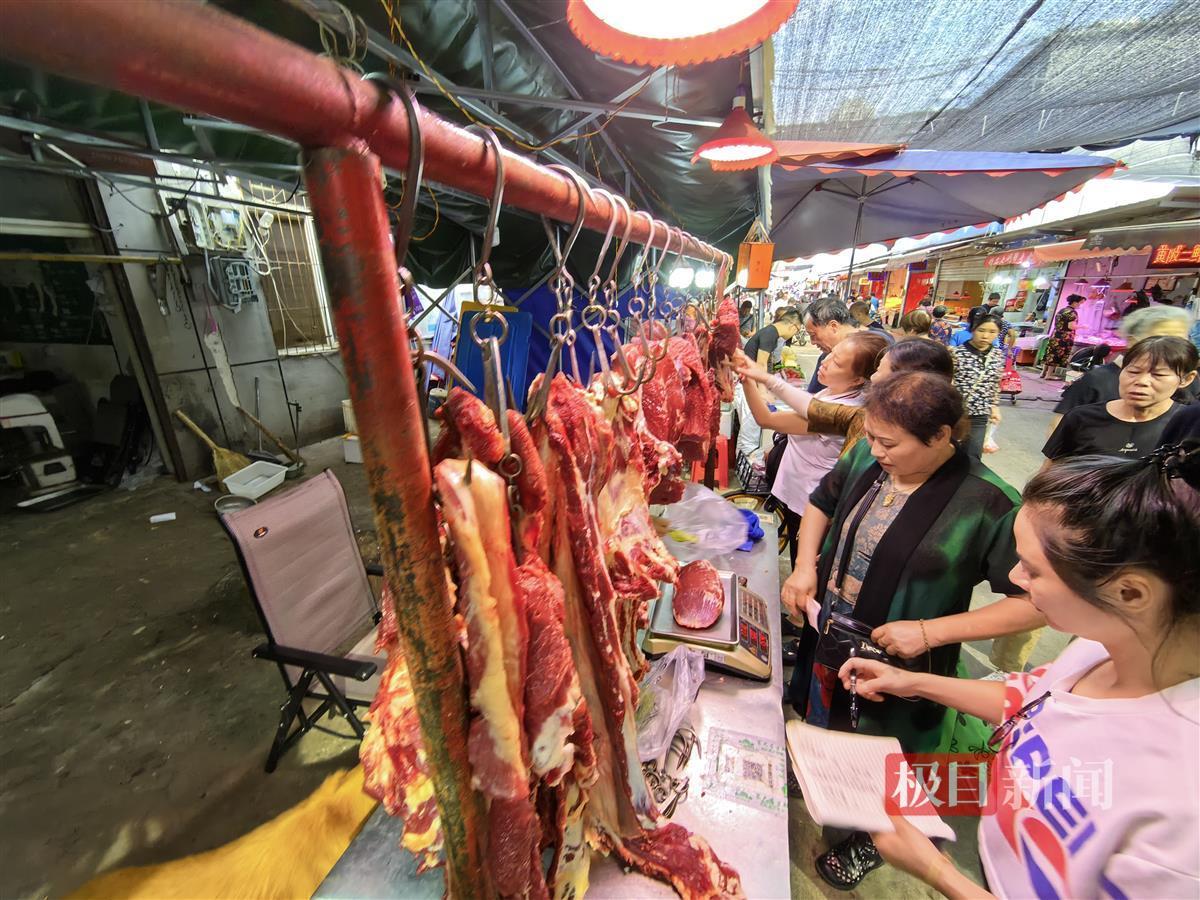 在齐女士买牛肉的摊位上,商家忙得不亦乐乎。一次次将挂着的牛腿肉、牛里脊、牛瓦沟、牛排骨等不同部位的牛肉取下、称重、包好,收钱。