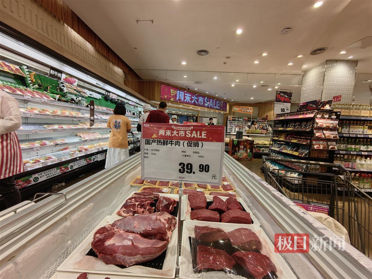 “好像是今年开始卖国产热鲜牛肉,促销做了蛮长时间,但不是每天都有力度这么大的优惠。”一位导购员介绍,国产牛肉每天都是新鲜送达,平时的价格还是会卖59.9元一斤,每周会有两天进行定期促销,然后每天晚上会再进行打折销售:“将近60元一斤确实比较高,但热鲜牛肉都是当天最新鲜的,促销的时候很受欢迎,卖得也比较快。”