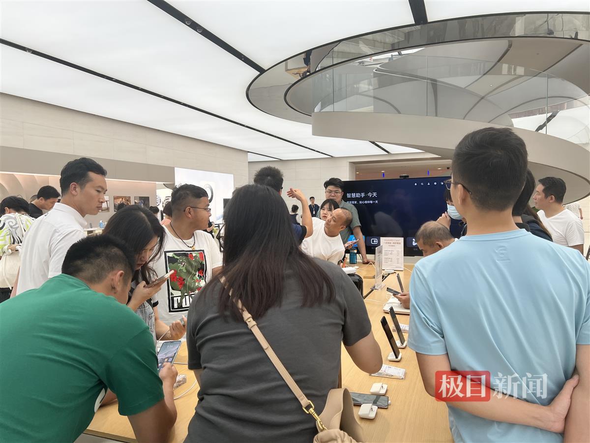 9月6日晚,极目新闻记者又来到位于武商梦时代的华为直营店看到,尽管离新机开售已过去一周,但消费者们的购机热情丝毫不减,直营店一楼中间的Mate60 Pro样机展示区域被前来体验的顾客围得严严实实,工作人员正在一遍遍向大家介绍并演示手机的新功能及用法。