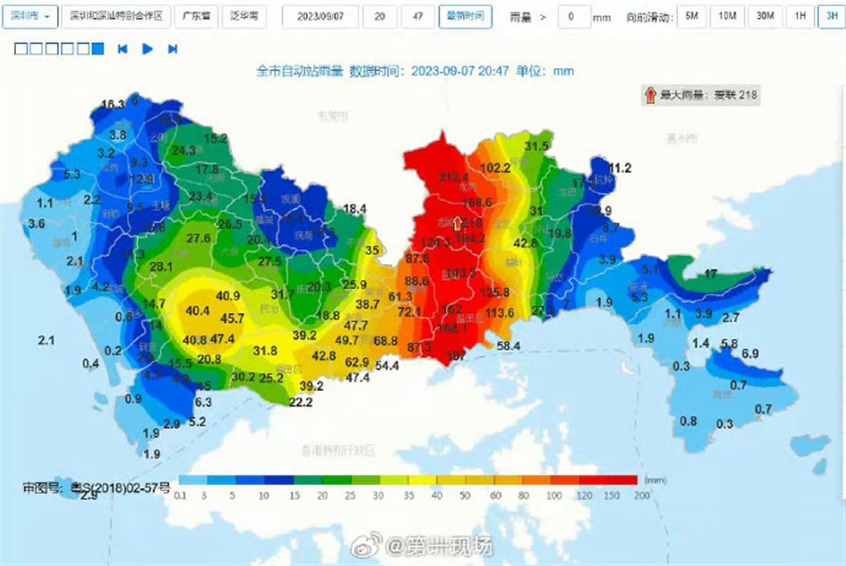 7日晚7时15分,深圳市气象台发布深圳市分区暴雨红色预警。晚9时24分数据显示,受台风“海葵”残余环流和季风共同影响,过去3小时,该市龙岗、盐田、罗湖出现大暴雨,期间全市最大累计雨量218毫米(龙岗区龙城街道爱联站),降雨具有“突发性强、短时雨强大、呈带状分布、列车效应明显”的特征。