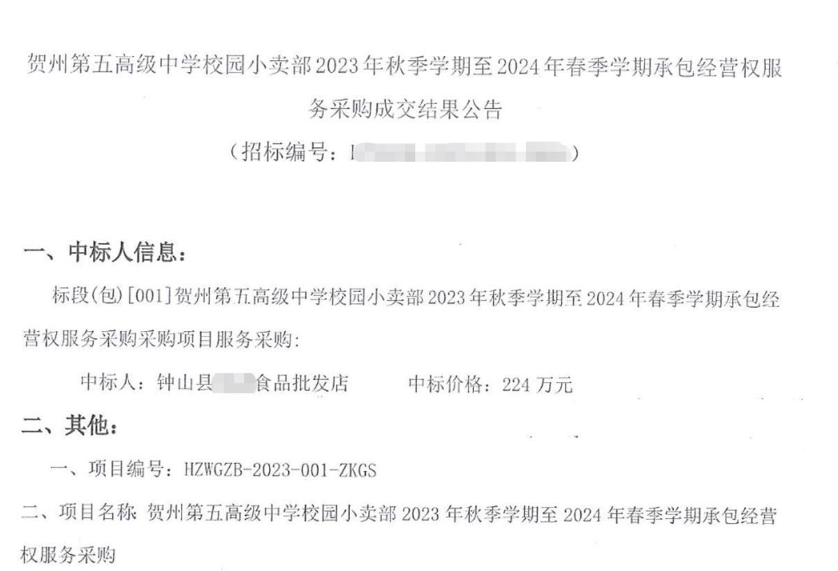 近日,有网友向极目新闻(报料邮箱:jimu1701@163.com)反映,今年8月,广西贺州第五高级中学以219万元预算,招标该校校园小卖部2023学年—2024学年的承包经营权服务。极目新闻记者了解到,该项目最终以224万元中标,中标的食品批发店于今年8月1日新成立。9月8日,记者就此次招标详情,咨询了贺州第五高级中学及招标代理单位。