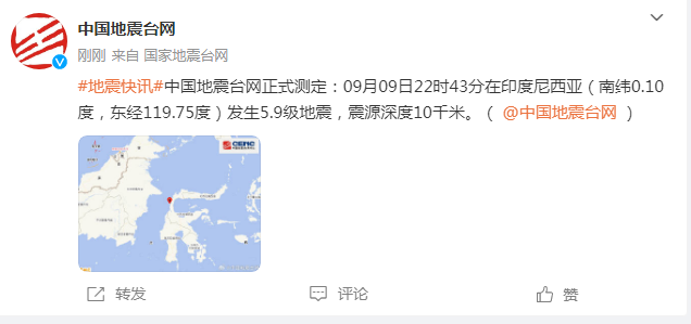 中国地震台网正式测定:09月09日22时43分在印度尼西亚(南纬0.10度,东经119.75度)发生5.9级地震,震源深度10千米。(