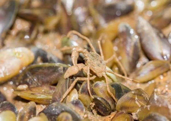 2021年12月,武汉水生生物专家在天兴洲进行野外调查时,掀开一块石头后,偶然在大量贻贝中间发现这种形如蜘蛛的小螃蟹。