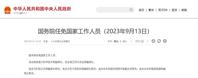 据中国政府网消息,国务院任免国家工作人员。任命陈家昌为科学技术部副部长;任命胡卫列为司法部副部长。免去刘钊的公安部副部长职务;免去许宏才的财政部副部长职务;免去向东的国务院研究室副主任职务;免去余兵的国家能源局副局长职务。