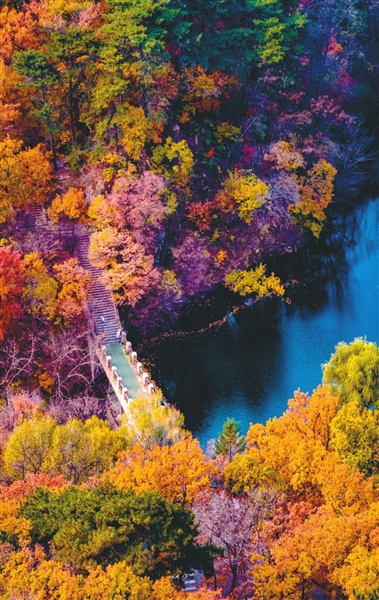 在千山,秋天的风光是持续的五彩缤纷。每到秋季,金色的银杏成为了千山秋季美景中的一大亮点,引得许多游客慕名而来。景区相关负责人介绍,位于千山核心景区的无量观上山路两侧,分布有大量银杏树。每到秋季,金色的银杏树蔚为壮观,这里被人们称为“银杏大道”,每年吸引数万游客来此观光打卡。景区内龙泉寺也有三棵较大银杏树,据说树龄最大的银杏树已经500岁了。景区工作人员告诉记者,如果秋季来千山,建议一定要去坐落在龙潭之上的飞龙桥。沿千山景区木栈道步行而上,行至龙潭,飞龙桥便映入眼帘。飞龙桥桥身主体白色配以明黄,造型古朴,横跨龙潭湖面,因其独特的造型和周围秀美的风景,这里也曾作为87版《红楼梦》踏雪寻梅一段的取景地而登上电视荧幕。据了解,千山银杏分布广泛,在千山财神庙、无量观、龙泉寺、大佛寺等处也均有分布。