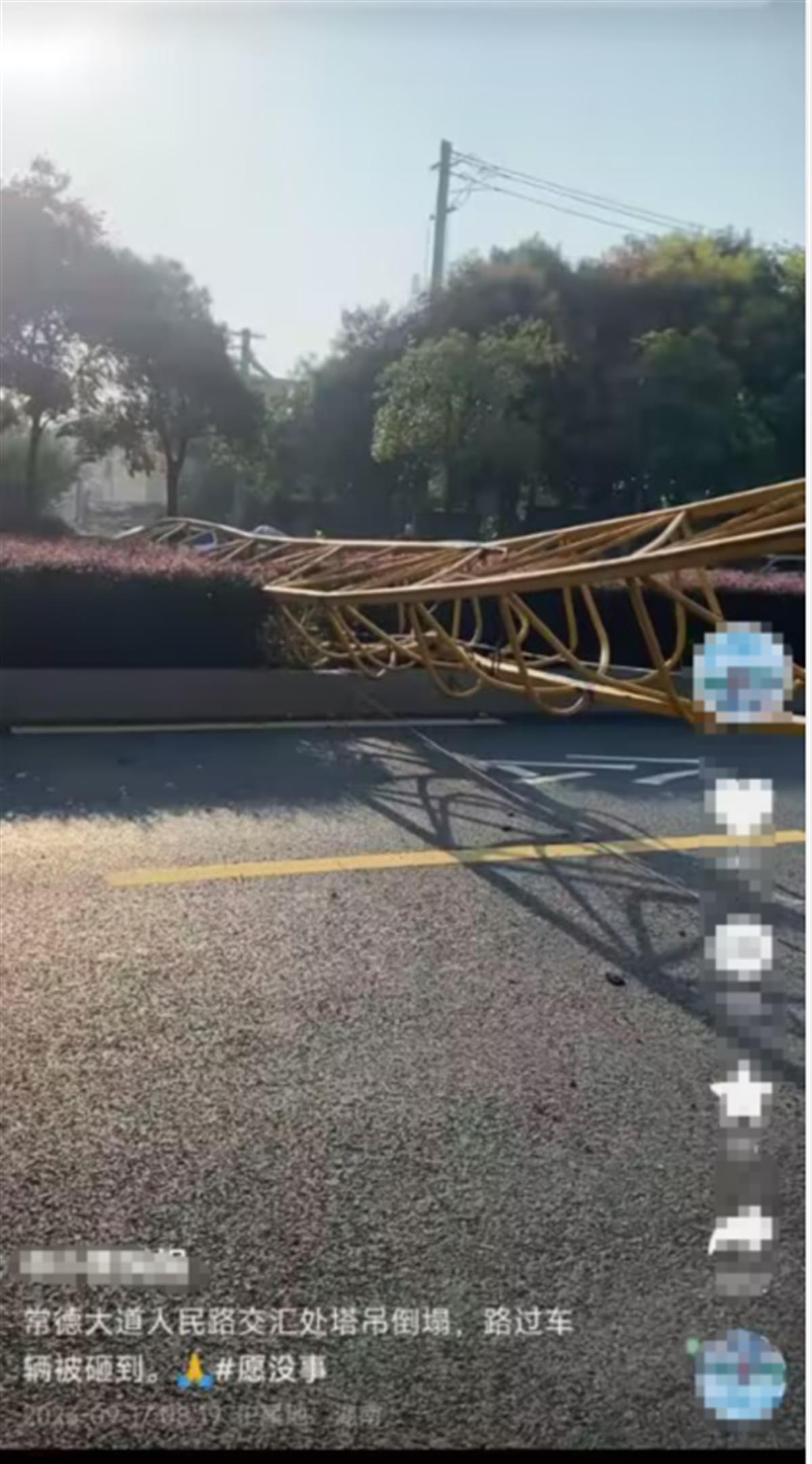 网络视频显示,路边一个工地的塔吊发生坍塌,塔身砸中一辆农用车的驾驶室,一部分塔身倒在常德大道路面上,农用车驾驶室被砸得严重变形。