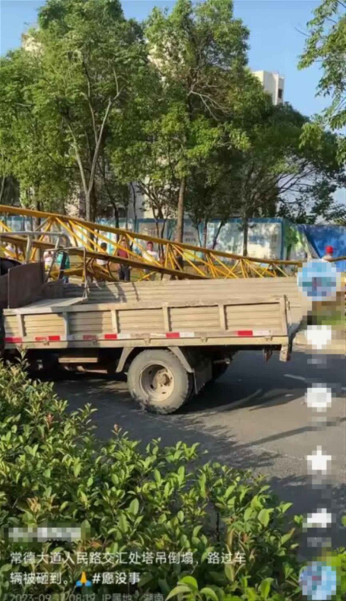 9月17日,湖南常德武陵区常德大道旁一个工地的塔吊发生坍塌,砸中一辆农用车后横在路面上,事故造成两人轻伤。目前,事故原因正在调查中。