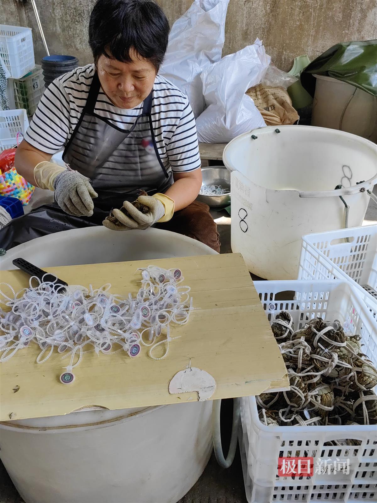 村民吴菊英60多岁了,她从18岁就开始接触螃蟹。在合作社里,她坐在小凳上,左手从筐里拿起一只螃蟹,右手迅速抽出扎蟹绳,将绳的其中一头用牙咬住,另一头横竖交叉地绑住螃蟹,最后系上两个结。这样就绑好了一只螃蟹。在场的扎蟹工人们说,她们在一小时内最快能扎好400只螃蟹,平均9秒一只。