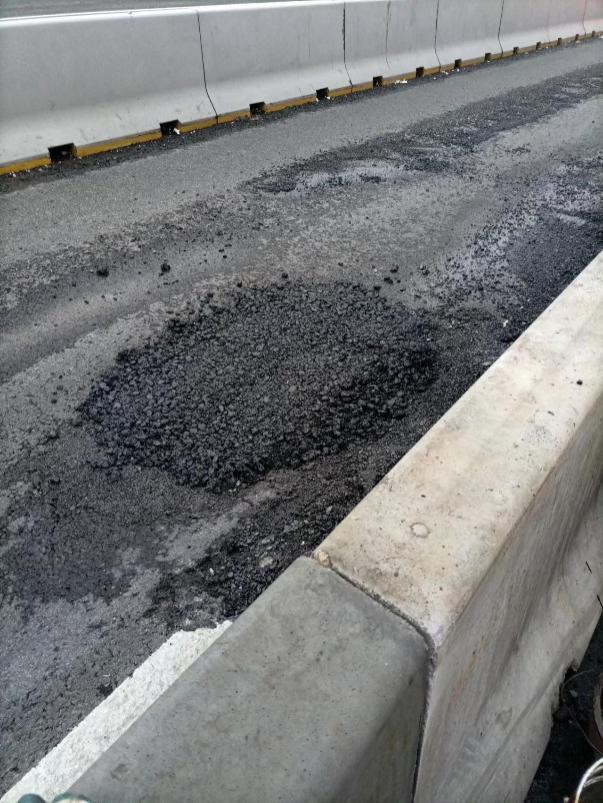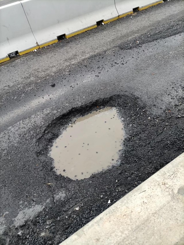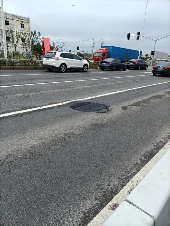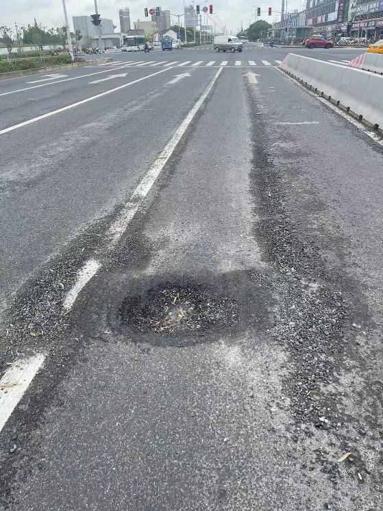 经现场核实,因9月21日至9月23日连续下雨,沥青不具备施工修复条件,且该车道为辅道两侧均设置隔离墩没办法现场放置警示标识封闭,施工养护单位已于9月21日晚当天组织人员对坑洼地方用沥青冷补料进行临时维修处置。修复后的沥青始终泡在雨水中导致压坏分离,在9月24号下午雨停的间隙施工养护单位再次对该坑洼地方用沥青料临时处置以保证该车道正常通车,后续将利用假期车流量低谷时段组织进行正式修复。